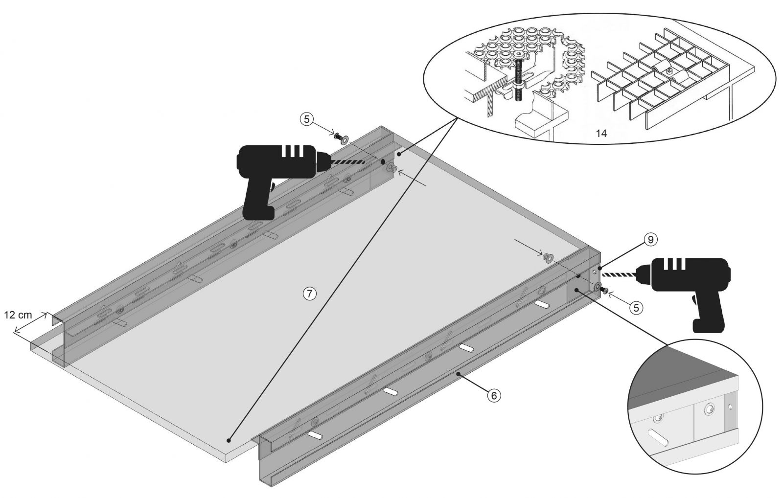 Schieben Sie die Verankerung des Podests an der Wand (Nr. 9) in den Podestwangen (Nr. 6), markieren Sie die Bohrlöcher und bohren diese. Befestigen Sie das Podest (Nr. 7) zu den L Träger (Nr. 8) mithilfe zweier Halterungen des Podestrostes (Nr. 14) an den ihnen gegenüberliegenden Ecken. Das Podest überragt die Podestwange um 12 cm – das Podest gilt als die letzte Treppenstufe (d. h. bei Podestlänge von 1000 mm, ist die Länge der Podestwangen von 880 mm). Die Oberseite des Podestrostes schließt an die Oberseite des Untergrunds hinter dem Podest an (= ein Übergang ohne Höhenunterschied wird erreicht).